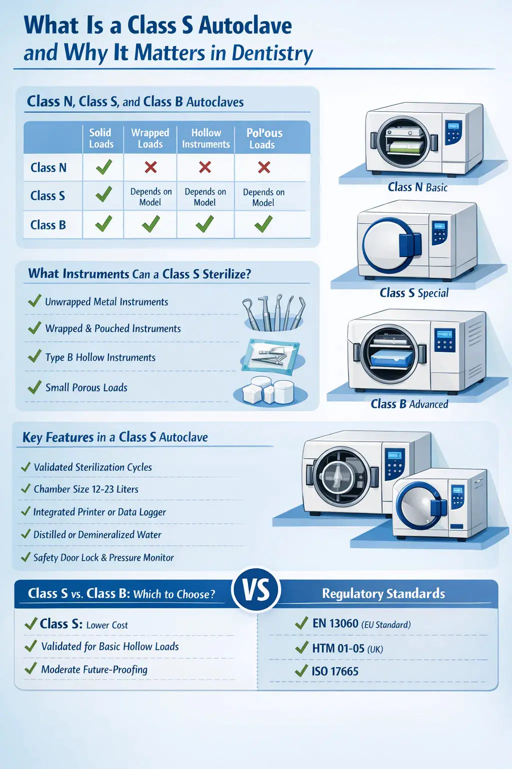 Тем не менее, стоматологический автоклав класса S остается разумным вариантом в определенных сценариях: в качестве вторичного устройства, работающего вместе с автоклавом класса B для ремонта твердых инструментов, в клиниках с очень ограниченным ассортиментом инструментов, не включающих критические полые нагрузки, или в юрисдикциях, где класс S соответствует всем применимым нормативным требованиям для конкретных обрабатываемых инструментов.