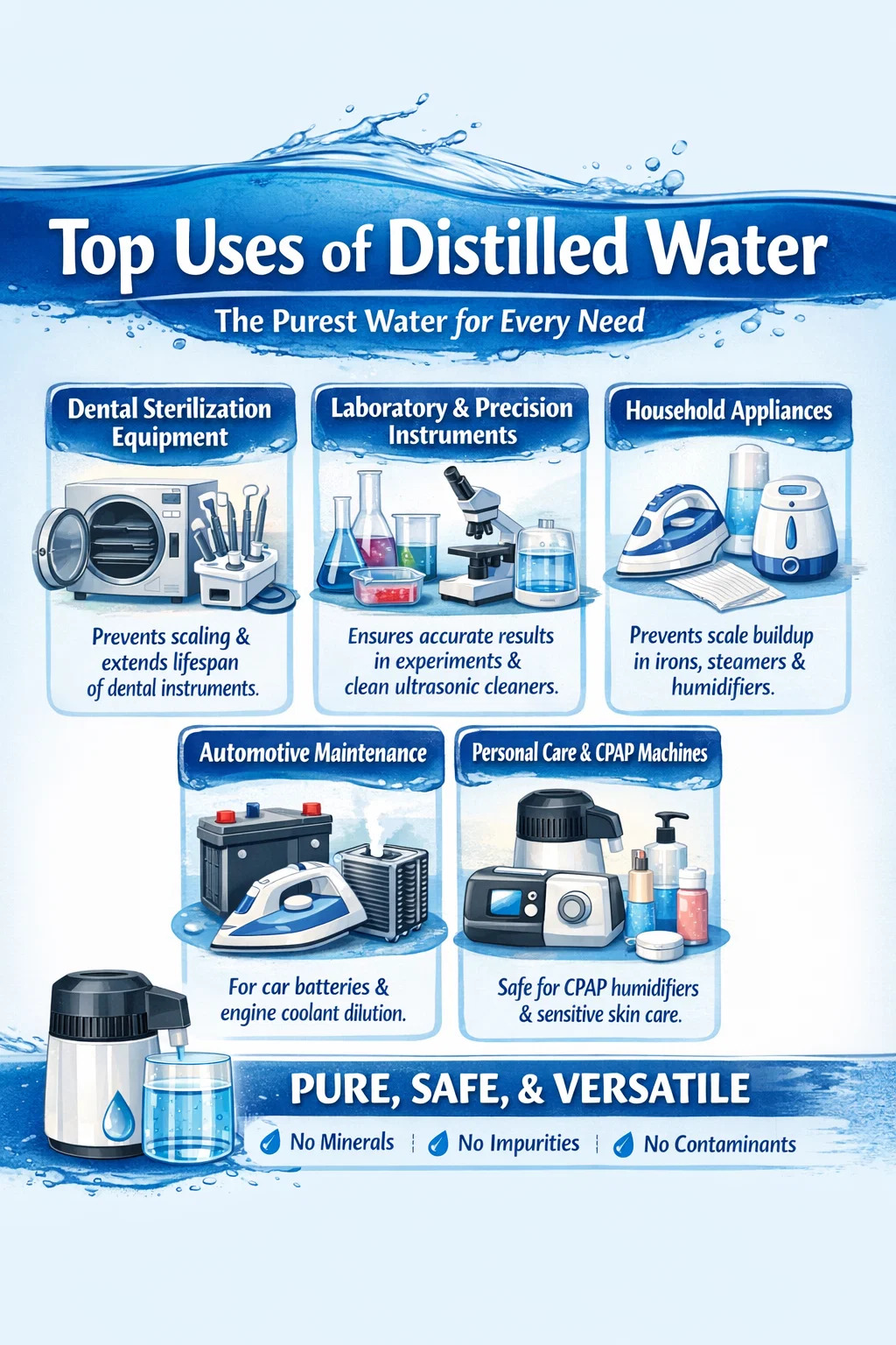 CPAP Machine Humidification: For people who need to wear a CPAP machine for sleep apnea, distilled water must be used in the humidifier tank to prevent inhaling mineral deposits and maintain the machine's internal hygiene.