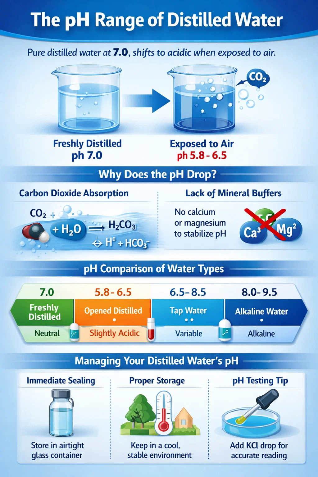 Растворимость CO2 увеличивается по мере охлаждения воды. Свежедистиллированная вода часто бывает теплой; когда он достигнет комнатной температуры, он будет поглощать газ быстрее. Хранение контейнера для хранения в стабильной среде с умеренным климатом помогает предотвратить резкие колебания pH .
